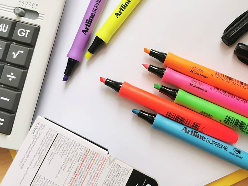 - Bút dạ quang: Còn được gọi là bút Highlight, dùng để đánh dấu đoạn, dòng, hay bất cứ mục gì mà người đọc cần làm nổi bật để ghi nhớ, với nhiều màu sắc vàng, xanh lá, hồng,…